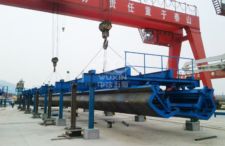 外模:結構牢靠,安裝、調試快捷方便;采用激光切割下料,成型精度高、側模通過調整底部千斤頂和螺旋撐桿來保證外形尺寸及標高,同時在地面與側模之間設置斜撐桿,在保證梁體外形尺寸的同時還能有效的防止模板上浮。