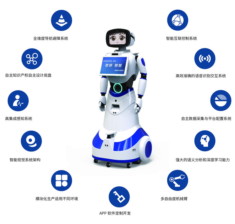 基于人工智能(Al)和機器學(xué)習(xí)(ML)技術(shù)L域的突破,經(jīng)過精細調(diào)研與充分論證,確保機器人控制智能、性能穩(wěn)定,通過不斷地創(chuàng)新研發(fā),重新定義服務(wù)機器人。智能商用服務(wù)機器人"創(chuàng)創(chuàng)" 集視覺、聽覺、觸覺、自由行走干—體。 可廠泛用于政符、金G、展館展廠工、教育、醫(yī)療、圖書館、商招、昌等L域。滿足客廣多元化需求。 "創(chuàng)創(chuàng)" 率先實現(xiàn)了把機器人的"大腦"和"小腦"完全向客戶開放,由止此可以迅速學(xué)習(xí)各個行業(yè)的專業(yè)知識并成為各個行業(yè)的專家。"創(chuàng)創(chuàng)"是您的小助手,好朋友!