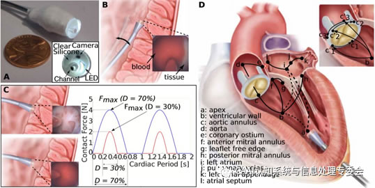 為提升介入手術的智能化、自主化,哈佛大學醫學院[4]從趨觸性的昆蟲中獲得靈感,研發了一種新型機器人導管。它可以在充滿血液的心臟中導航,這種導管使用混合觸覺、視覺的感知方法,使用圖像進行基于觸摸的表面識別和力傳感,以完成充滿血液的心臟內壁跟蹤。觸覺視覺傳感器提供了導管尖端的G分辨率視圖,這正是壁跟蹤和設備部署所需的視圖。該傳感器與機器學習和圖像處理算法相結合,使機器人能夠區分其接觸的物體并控制其接觸力。但在一些特殊、復雜的位置移動時,如:主動脈瓣環,成功率還有待提升。在未來,壁跟蹤自主導航可擴展到許多微創手術,包括血管、氣道、胃腸道和腦心室系統的手術。