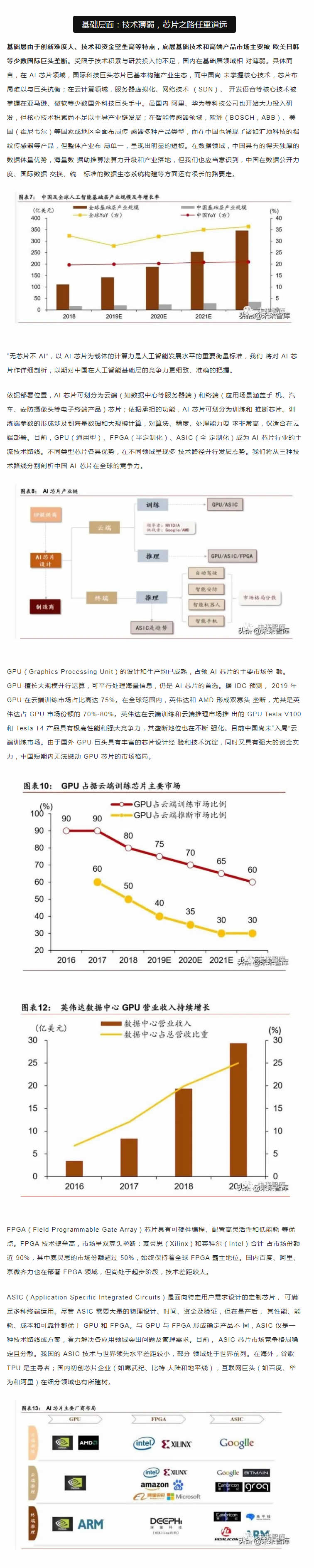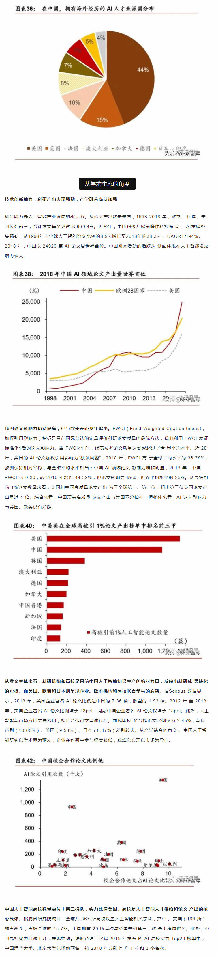 從中短期看,技術優化、落地場景的開拓和滲透是是主要的增長點;從長期看,智能生 態體系建設才是彎道超車的必由之路。人工智能產業的核心競爭力在于生態體系的建設, 包括大數據、算法理論、底層技術、應用生態、人才儲備等層面。而我國人工智能產業生 態和基礎設施建設正處于探索期,如何實現核心技術的突破和拓寬人工智能技術與社會經 濟融合場景著力點在于人才儲備和持續的研發投入。從人才的角度,收窄技術差距的根本 在于優化人的知識結構和能力。當前政策應側重建立人才培養體系,為人工智能打造人才 資源池,尤其是在基礎學科L域突破人才瓶頸。同時,打破“唯數量論”的科研評價和考 核體系,改變人才激勵機制勢在必行。我國人工智能專利申請和科研產出數量L先, 但質量堪憂。唯有從源頭改變評價機制,才能扭轉“量多而質優”的問題。從研發的角度, 企業技術優化和創新能力是解決產業痛點的關鍵。基礎研究的投入周期長、不確定性大、 和風險G特點決定了其難以短期內獲得投資回報,但基礎L域的突破將為經濟帶來長期和 廣泛的溢出效應,因此,國內更應關注底層技術的研發投入,扭轉傳統技術路徑,顛覆核 心技術受制于人的被動局面。此外,人工智能在賦能機器模擬人類進行決策的同時產生的 倫理道德、隱私保護和社會安全問題值得關注。由于法律法規存在滯后性,尚無法對人工 智能技術進行有效監管。我國應加快人工智能倫理研究,及早識別人工智能治理風險。
