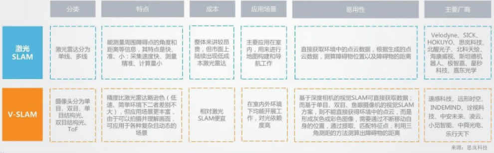 SLAM系統(tǒng)通常包含多種傳感器和多種功能模塊。按照核心的功能模塊區(qū)分,目前常見的機器人SLAM系統(tǒng)可分為兩種形式:基于激 光雷達的SLAM(激光SLAM)和基于視覺的SLAM(V-SLAM)。激光SLAM目前發(fā)展比較成熟、應(yīng)用廣泛,未來多傳感器融合的SLAM 技術(shù)將逐漸成為技術(shù)趨勢,取長補短,更好地實現(xiàn)定位導(dǎo)航。