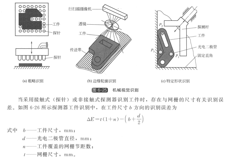 機械視覺識別如圖6-25所示,圖6-25(a) 為使用探針矩陣對工件進行粗略識別,圖6- 25(b) 為使用直線性測量傳感器對工件進行邊緣輪廓識別,圖6-25(c) 為使用點傳感技術(shù)對 工件進行特定形狀識別。
