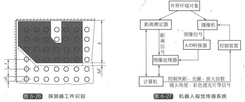 圖6-27所示為機器人視覺傳感系統的原理。攝像機獲取環境對象的圖像,經 A/D 轉 換 器轉換成數字量,從而變成數字化圖形。通常一幅圖像劃分為512×512或者256×256,各 點亮度用8位二進制表示,即可表示256個灰度。圖像輸入以后進行各種處理、識別以及理解,另外通過距離測定器得到距離信息,經過計算機處理得到物體的空間位置和方位;通過 彩色濾光片得到顏色信息。上述信息經圖像處理器進行處理,提取特征,處理的結果再輸出 到機器人,以控制它進行動作。另外,作為機器人的眼睛不但要對所得到的圖像進行靜止處 理,而且要積極地擴大視野,根據所觀察的對象,改變眼睛的焦距和光圈。因此,機器人視 覺系統還應具有調節焦距、光圈、放大倍數和攝像機角度的裝置。