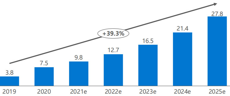 受新G疫情的防疫需求帶動,加之清潔行業長期面臨招工難、人力成本G等 痛點,商用清潔機器人的市場需求愈發旺盛。特別是具備智能消毒功能的清 潔機器人,通過集成消毒液自動噴灑系統,實現全域噴霧消殺,可以有效降 低人力工作強度和交叉感染風險,已在地鐵站、機場、辦公區、展館、酒店 等場景加速落地應用。在需求驅動下,商用清潔機器人的市場規模快速增長。 2019年中國商用清潔機器人的市場規模約3.8億元,預計2021年將達到9.8 億元,2025年將達到27.8億元,年復合增長率約39.3%*。