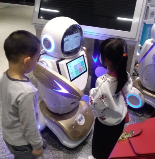 智能對話機器人正在和小朋友對話互動呢,這是對話互動現(xiàn)場,小朋友和機器人都很認真呢...